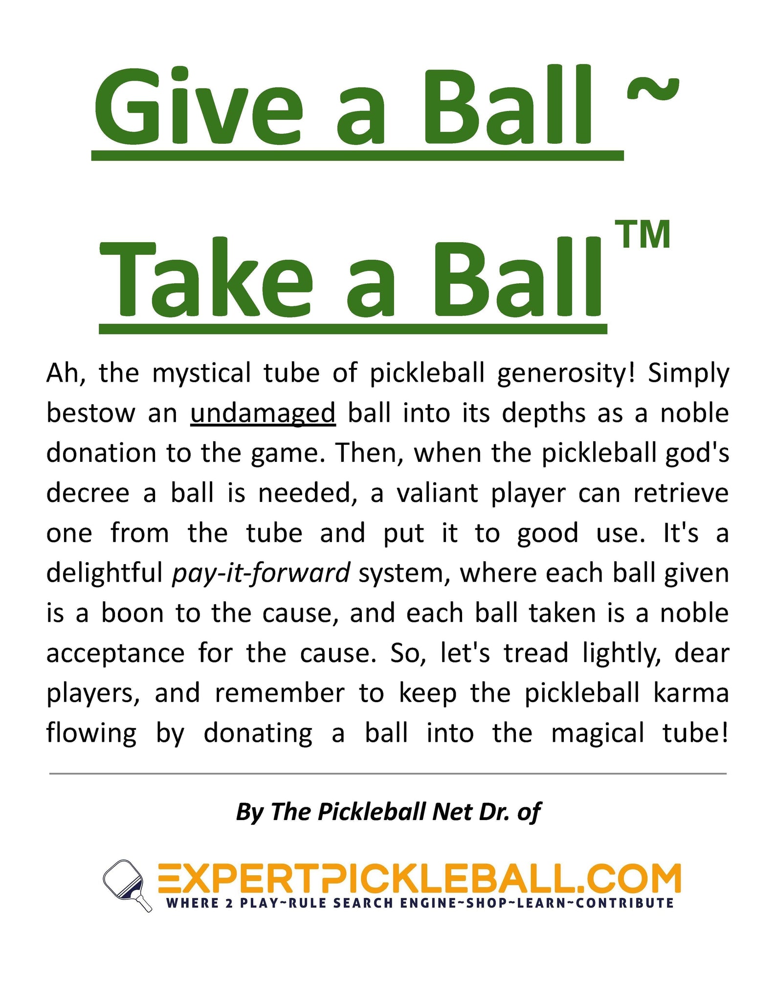 "Ah, the mystical tube of pickleball generosity! Simply bestow an undamaged ball into its depths as a noble donation to the game. Then, when the pickleball god's decree a ball is needed, a valiant player can retrieve one from the tube and put it to good use. It's a delightful pay-it-forward system, where each ball given is a boon to the cause, and each ball taken is a noble acceptance for the cause. So, let's tread lightly, dear players, and remember to keep the pickleball karma flowing by donating a ball into the magical tube!"